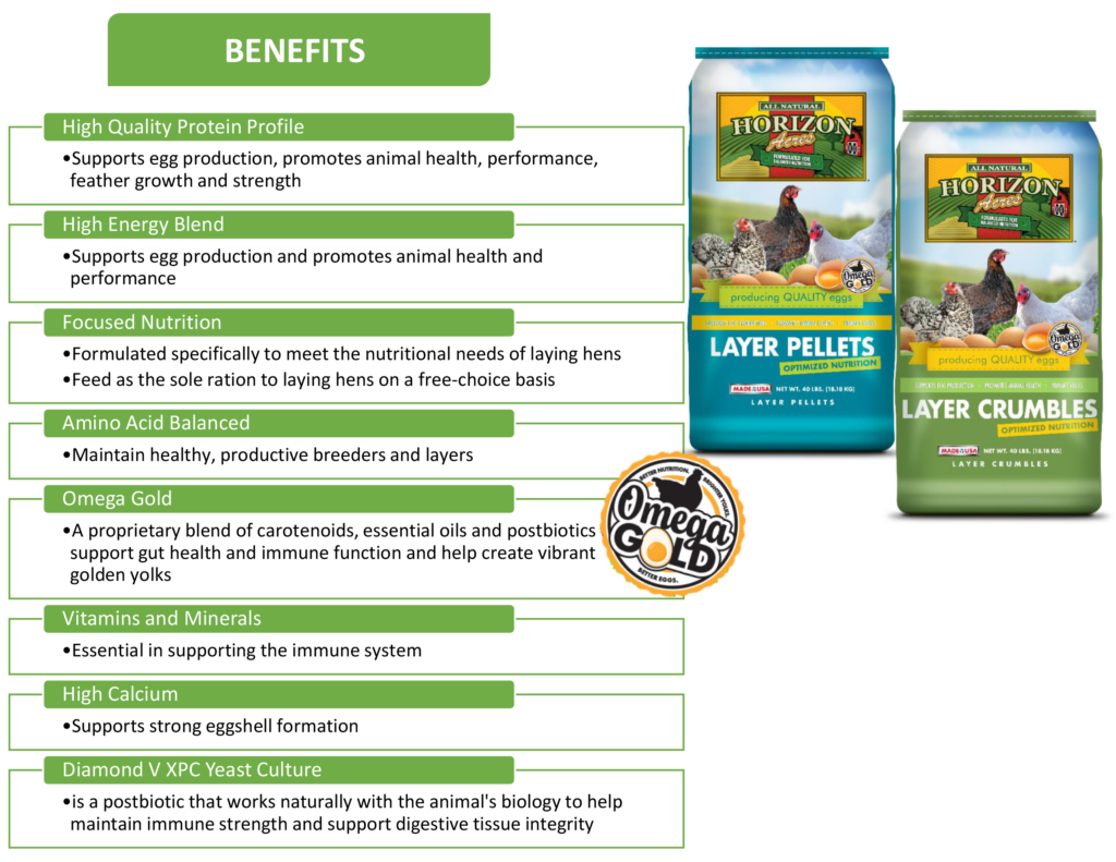 Gold Standard Nutrition Starts Here: Horizon Acres Layer Pellets and Horizon Acres Layer Crumbles will now feature Omega Gold – our proprietary blend of carotenoids, essential oils & postbiotics to support gut health and immune function and help create vibrant golden yolks